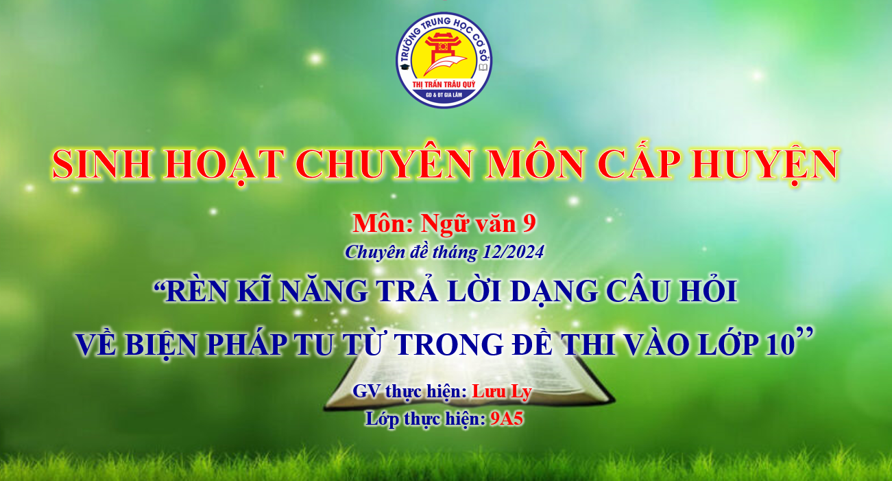 Với mục đích rèn luyện cho học sinh lớp 9 kĩ năng làm bài thi, Tổ chuyên môn Xã hội trường THCS Thị trấn Trâu Quỳ nói chung và nhóm Ngữ văn nói riêng cùng với sự tư vấn của cô Nguyễn Thị Phượng – chuyên viên Phòng Giáo dục đã thực hiện tiết chuyên đề với nội dung: Chuyên đề: Rèn kĩ năng trả lời dạng câu hỏi đọc hiểu về biện pháp tu từ trong đề thi vào lớp 10. Chuyên đề được xây dựng nhằm mục tiêu giúp học sinh xây dựng được kĩ năng trả lời câu hỏi và trình bày bài thi với dạng câu hỏi về biện pháp tu từ, một trong những dạng bài quan trọng thường xuất hiện trong đề thi vào 10.