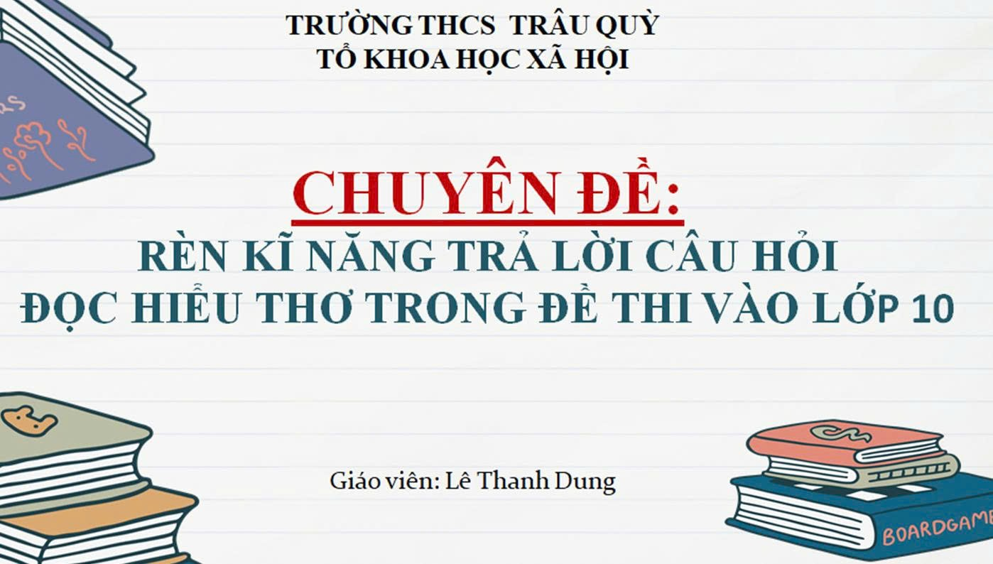 . Có thể khẳng định rằng: dạng câu hỏi “rút ra thông điệp” trong phần Đọc hiểu thơ là một nội dung mang tính vận dụng cao trong đề thi tuyển sinh vào lớp 10. Nó không chỉ đánh giá năng lực đọc hiểu mà còn giúp học sinh thể hiện suy nghĩ, thái độ sống, nhân sinh quan của bản thân.Vì vậy, chuyên đề “Rèn kĩ năng trả lời câu hỏi đọc hiểu thơ trong đề thi vào lớp 10” mang ý nghĩa quan trọng, góp phần nâng cao hiệu quả giảng dạy Ngữ văn. Sau khi tổ nhóm tích cực xây dựng nội dung chuyên đề và lựa chọn thực hiện trên khối lớp 9, cô giáo Lê Thanh Dung và các em học sinh lớp 9A5 thực hiện tiết dạy minh họa TIẾT 6: ĐỌC HIỂU NGỮ LIỆU MỚI: THƠ